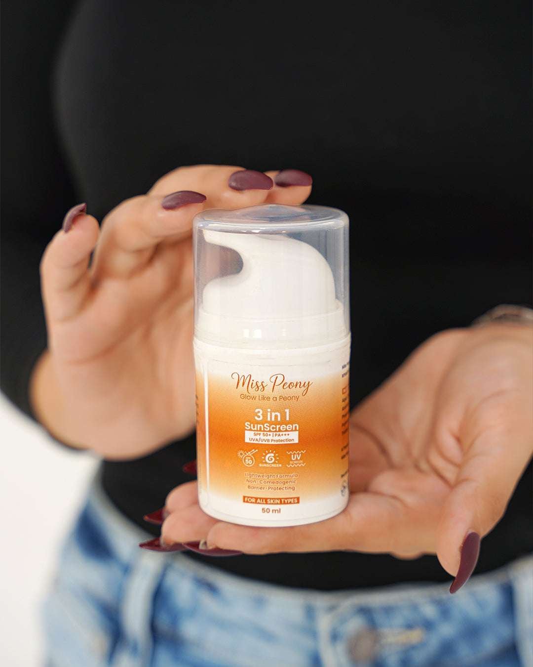 Protect, hydrate, and glow with the Miss Peony 3-in-1 Sunscreen, your daily essential for defense and radiance.